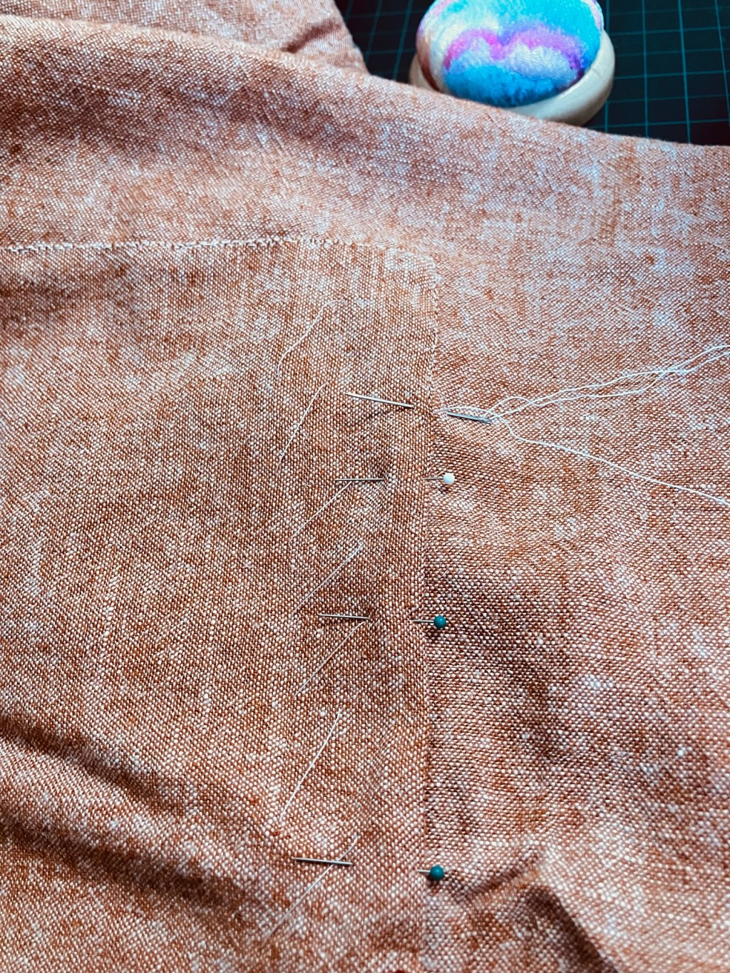 I’ve decided to compromise. I’m going to finish sewing the pocket on with just one row of backstitching. (I had been doing two rows.) then I will finish sewing the dress and come back to hand stitching the second row when the dress is sewn. If I even still want to do it.